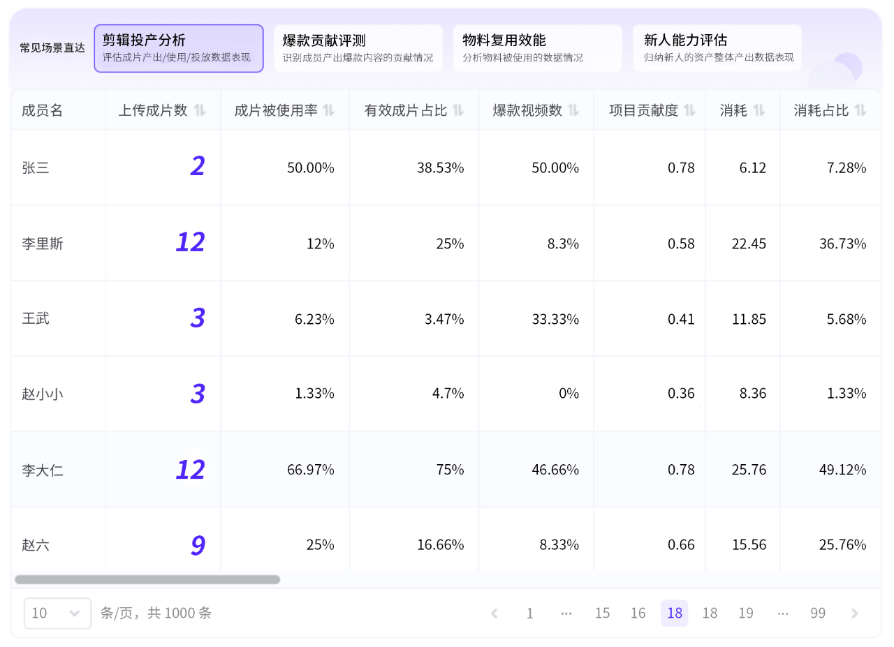 通过「成员创作动态」,洞察每个成员对爆款内容的直接贡献。无论是脚本创意、拍摄技巧,还是后期剪辑,都可以在这里直接看到被使用率、贡献度。