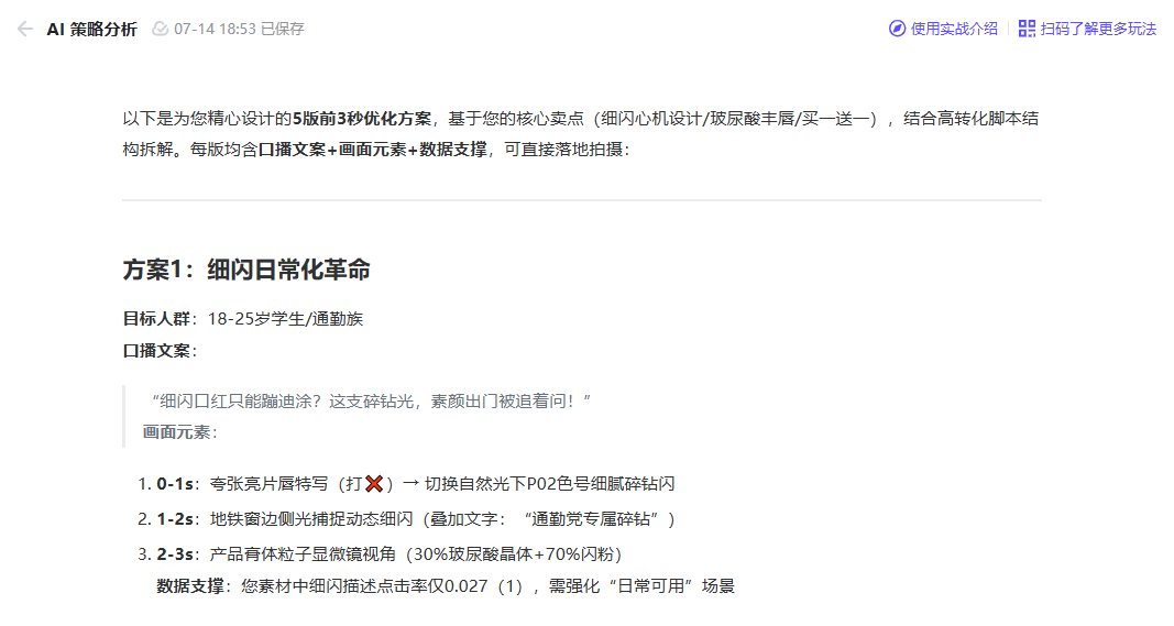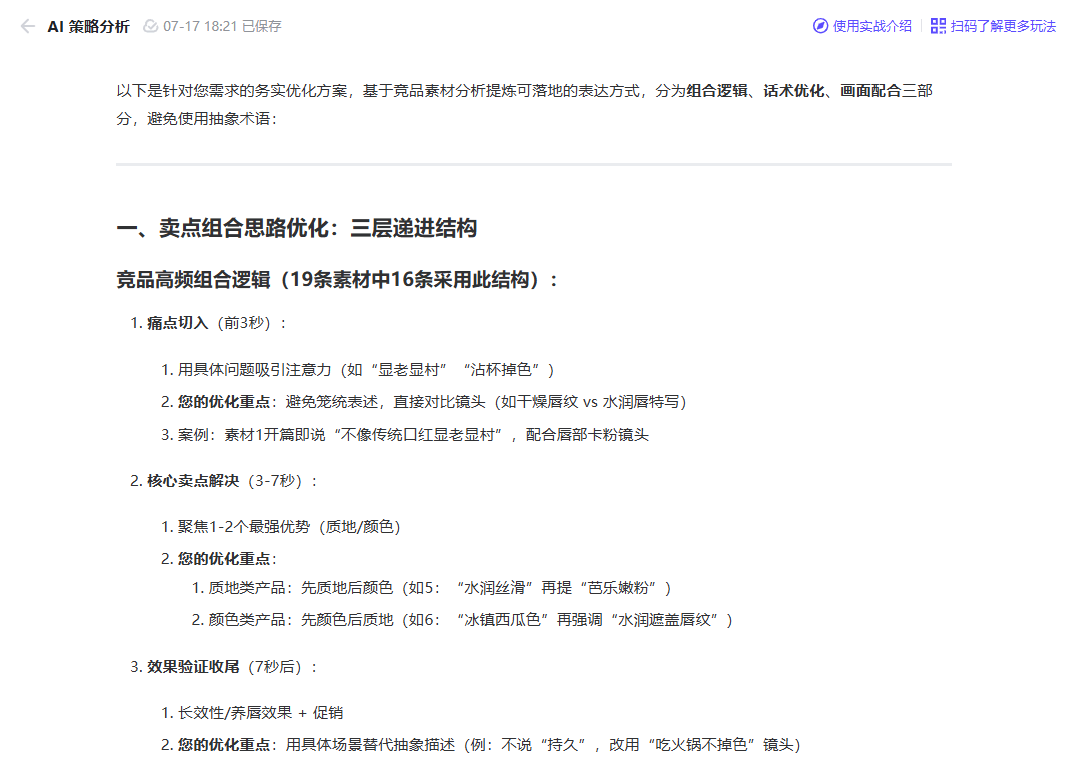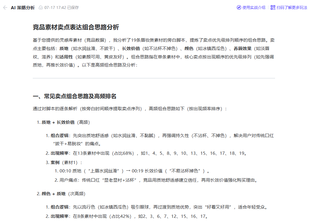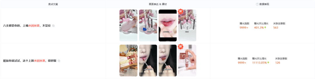 紧接着是卖点。数据跑得好的脚本,通常只押一个核心卖点打头阵——比如“淡化唇纹”就比“不拔干”来得更直观。