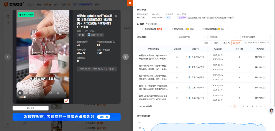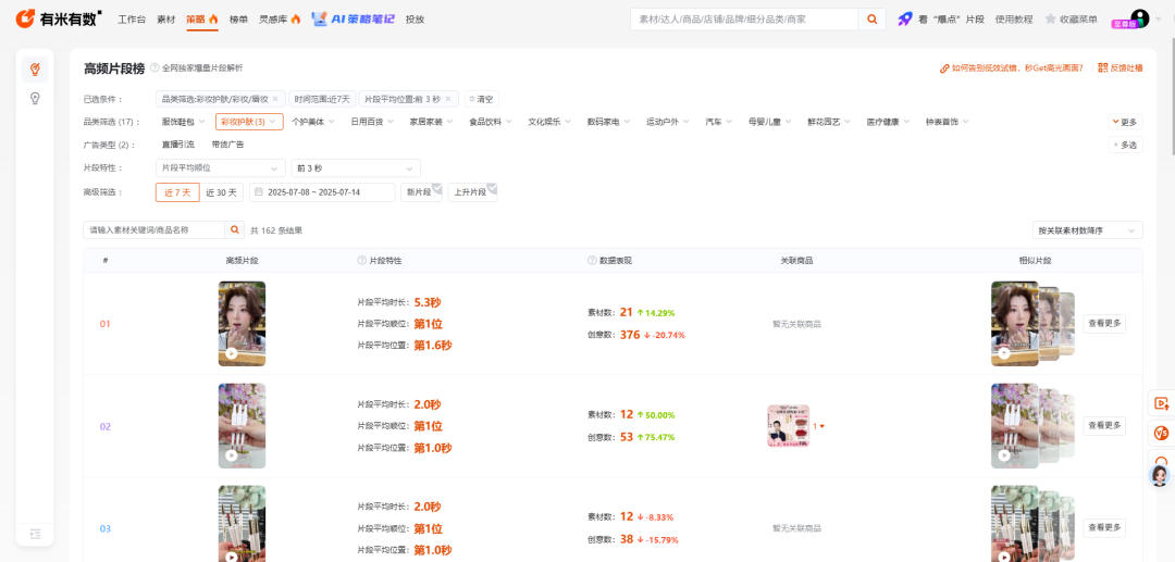 接下来,先找行业对标:打开有米有数官网的“高频片段榜”功能,筛选你的产品所在类目的“近7天”“前3秒”的片段。