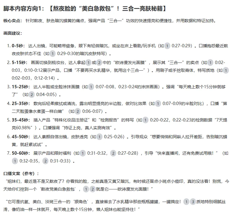 和这位达人合作,可以如何结合她的视频风格,又能结合我们品牌心智相关的效果描述和认证背书,帮我构思脚本内容方向3个,突出我们“美白”的品牌心智。内容需包含文案和画面建议。