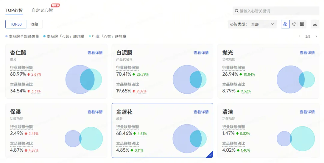在这里,品牌心智可以通过联想份额来具象化。用户联想越多,份额越高,心智越强。以下图这个护肤品牌的demo为例: