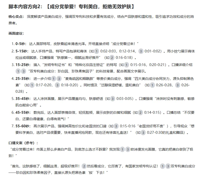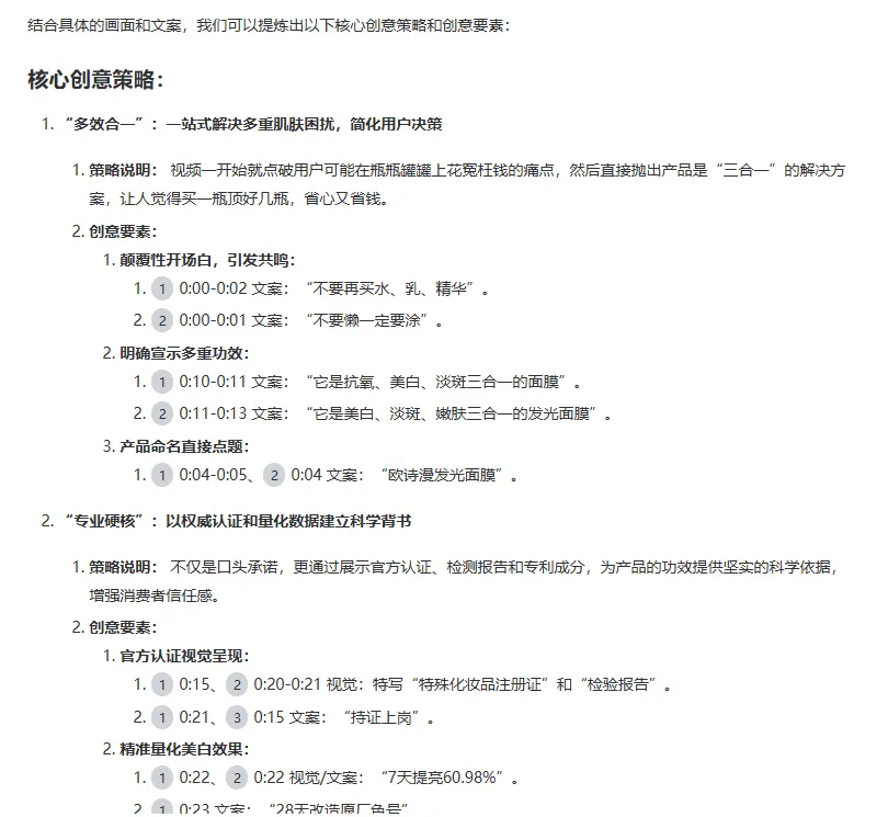 这些素材对于欧诗漫美白的商品心智联想表现更高,请结合这些素材具体画面和脚本文案,提炼核心创意策略和要素,涉及视频信息可标注具体时间点。