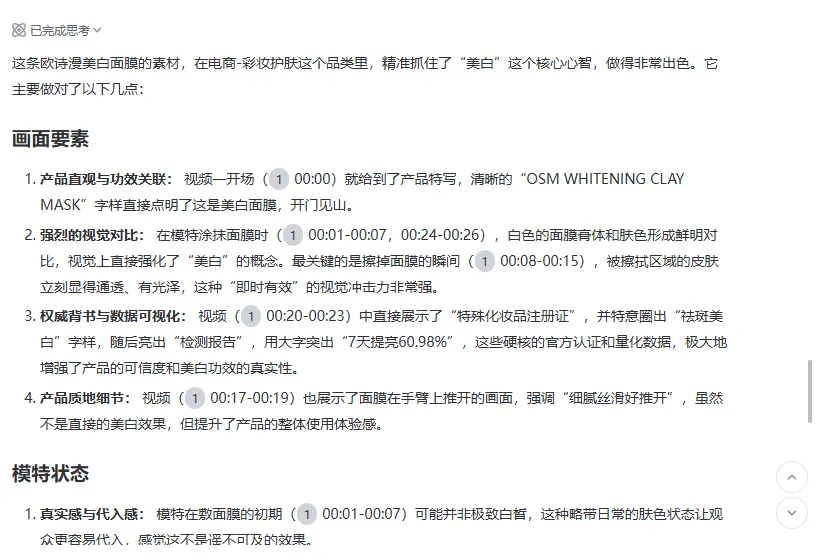 欧诗漫的商品心智是美白,这条素材更容易联想到欧诗漫的美白心智,请从画面要素、模特状态、光线氛围、脚本文案等来分析做对了什么,涉及视频信息请标注具体时间点。
