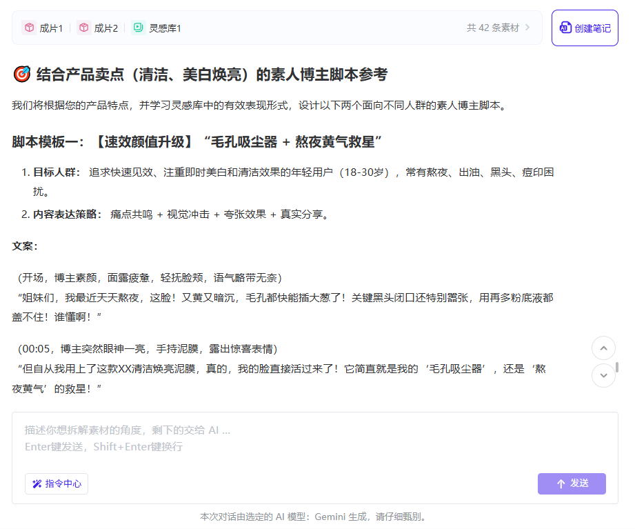 帮我拆解灵感库素材里卖点的表现形式;参考这批素材,结合我 [产品清洁和美白焕亮] 的卖点,输出面向不同人群的脚本参考(包括文案和画面),适用于素人博主分享产品体验的场景,时长30秒左右。