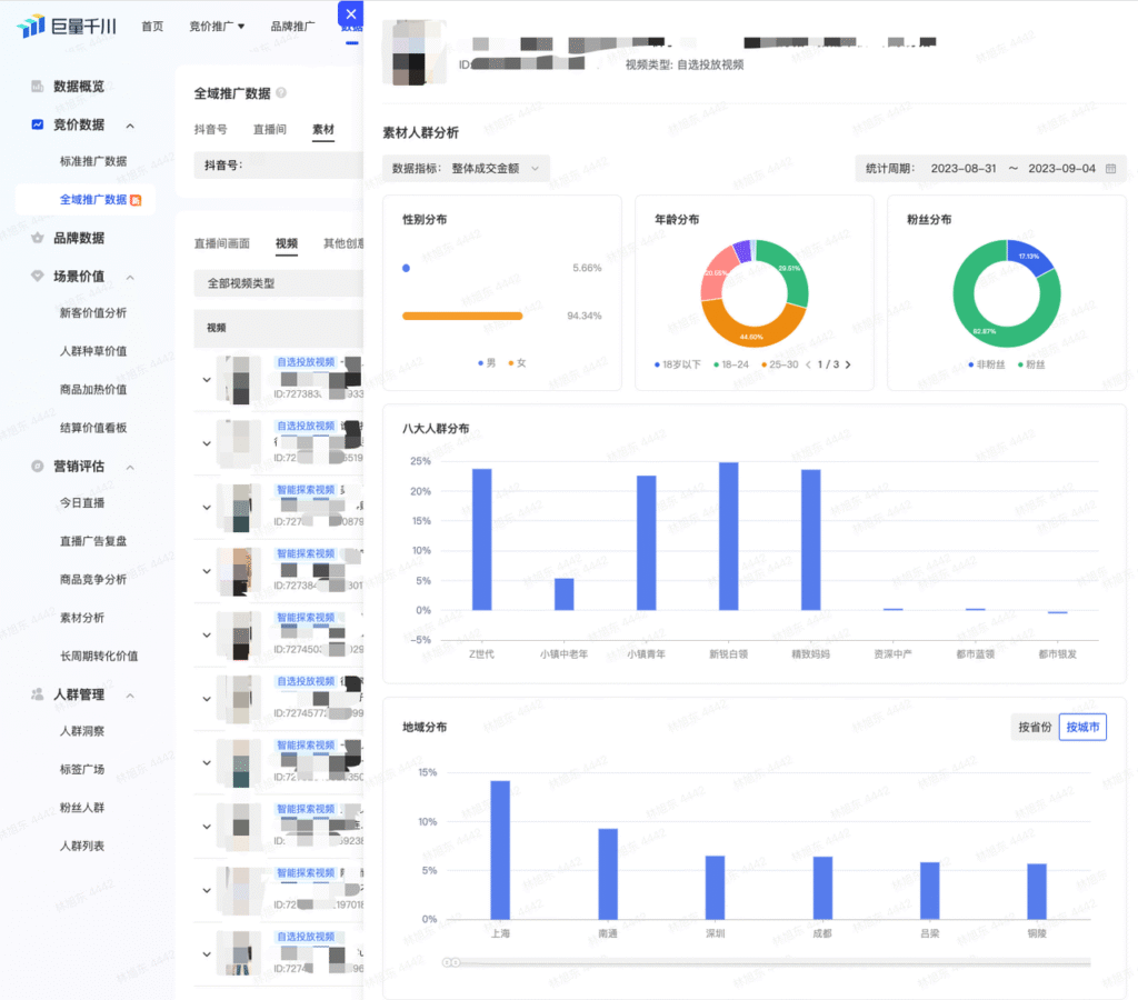 重点对比素材的“展示人群”“点击人群”和“成交人群”画像:
