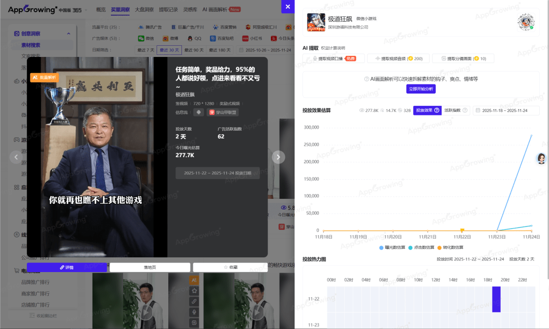 比如,我们可以在 AppGrowing 的广告素材这里,找一个爆款游戏行业的投放素材,看得出是 AI 做的也行,看不出是不是 AI 做的也没关系。