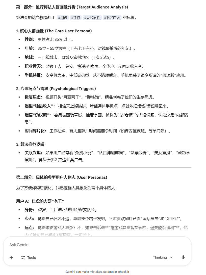 Gemini 3 Pro 在人群画像方面的解析也非常优秀,具体画像、痛点与需求,算法推荐逻辑都能精准给出。