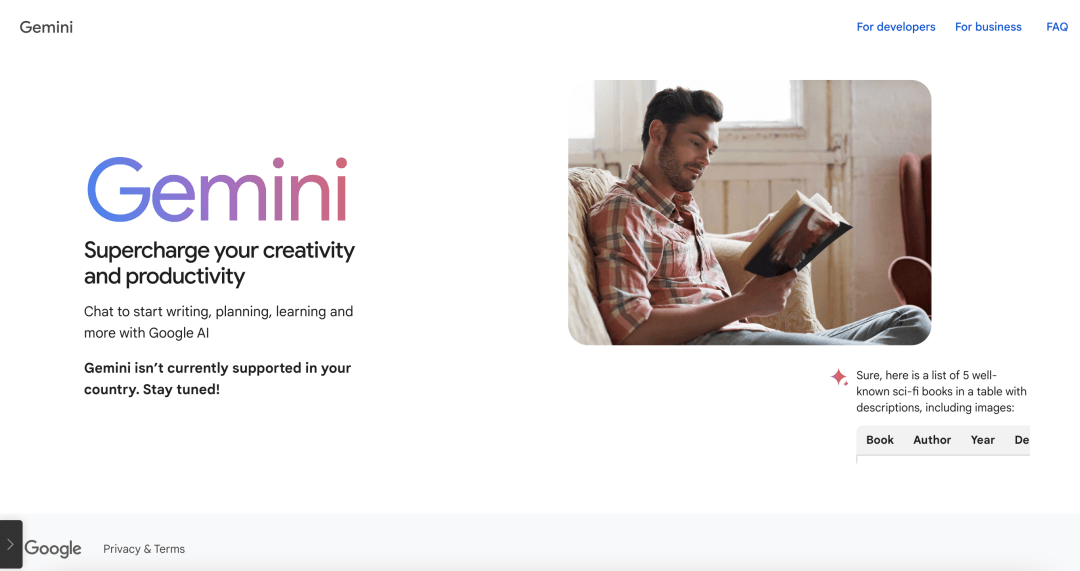 第一个要解决的能进入 Gemini 官网的问题,不是科学上网就百分百能用,也有可能今天能用,明天就变成 Gemini isn't currently supported……